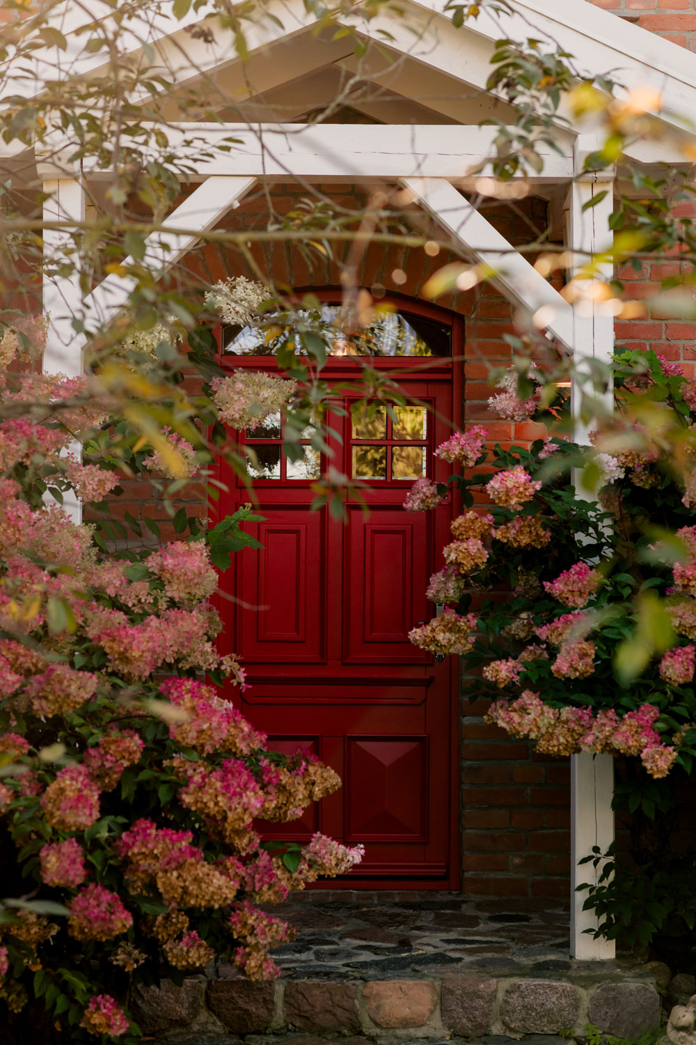 Latem życie przenosi się na taras, gdzie centralnym punktem jest spektakularny żyrandol zaprojektowany przez młodych polskich artystów. Dom otula ogród, w którym stare drzewa i hortensje tworzą bajkową scenerię, a w tle słychać tylko ciszę i śpiew ptaków.